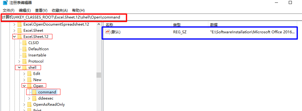 开始找要修改的位置:HKEY_CLASSES_ROOT\Excel.Sheet.12\shell\Open\command (如果一个一个找你嫌麻烦就直接复制这个位置,粘贴到图中红色粗线框的位置后回车),在右边蓝色粗线框中默认上双击:
