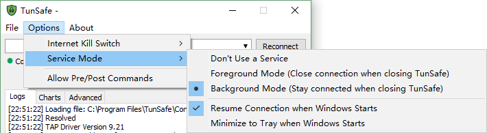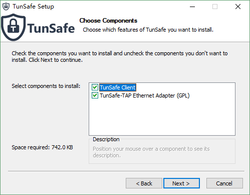 TunSafe 在 Windows 环境中安装时,需要安装 TunSafe Client 与 TunSafe-TAP Ethernet Adapter (GPL) 两个程序