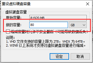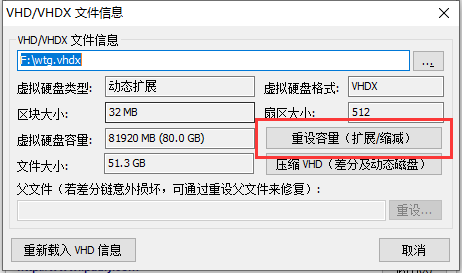 注意:已经拆分的VHD不能随意调整容量,需要先合并VHD或删掉子VHD!!