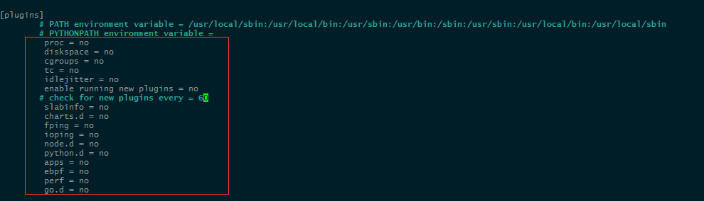 如果觉得默认的仪表盘展示的图表太多,可以vim /etc/netdata/netdata.conf或者nano /etc/netdata/netdata.conf ,修改[plugins]中的配置。原配置文件中大部分默认开启的,如果我们不需要某些图表的话,可以将注释去掉,改为no。然后重启服务,就可以禁用相应的图表。