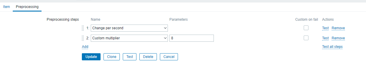 Custom multiplier—-将该值乘以指定的整数或浮点值,使用此选项转换接收到的以等变成B、Bps、KB、MBps为单位的值。 否则 Zabbix无法正确设置。