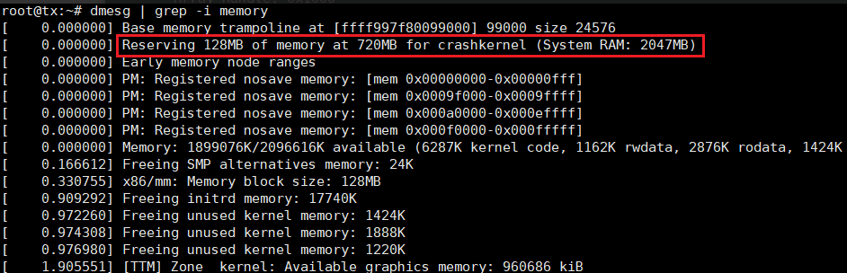 使用命令 dmesg | grep -i memory 查看内核预留内存,注意到如下部分: