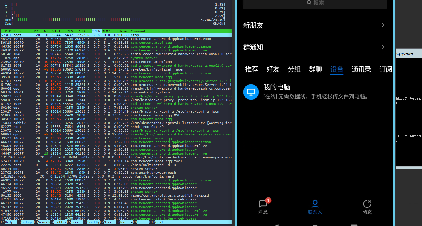 C:\remote-adb>scrcpy.exe scrcpy 1.24 <https://github.com/Genymobile/scrcpy> C:\remote-adb\scrcpy-server: 1 file pu...pped. 2.8 MB/s (41159 bytes in 0.014s [server] INFO: Device: Xiaomi redroid13_arm64 (Android 13) INFO: Renderer: direct3d INFO: Initial texture: 720x1280 WARN: Killing the server... #adb连接成功后,直接cmd窗口运行,这个程序就会打开一个安卓的窗口