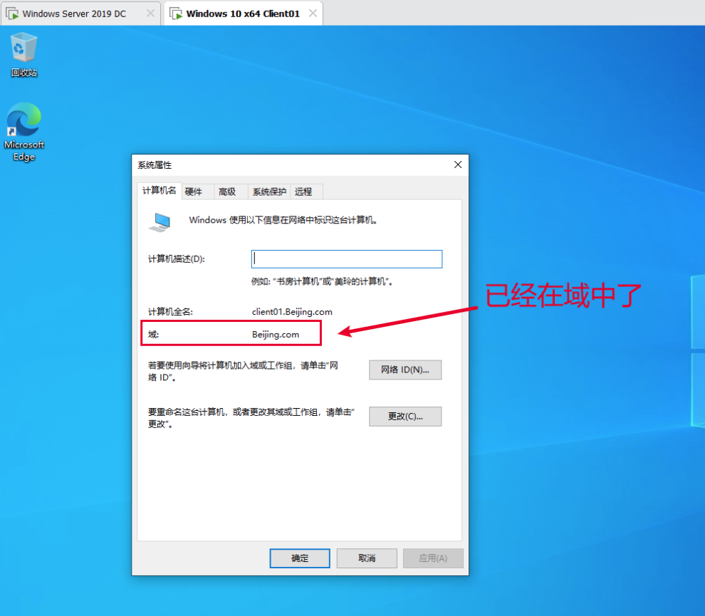 ctrl+r输入sysdm.cpl- 更改计算机名为client01, 域名是Beijing.com,然后输入域的管理员账号密码administrator:First456.,成功后重启