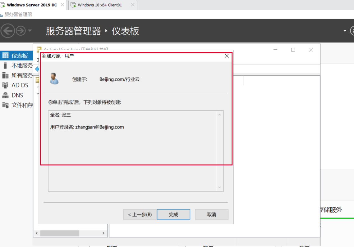 Active Directory 用户和计算机- 在Beijing.com新建组织单位 - 名称起名 为行业云在行业云右键 新建用户 - 姓名张三 - 登录名 zhangsan - 下一步 - 密码
