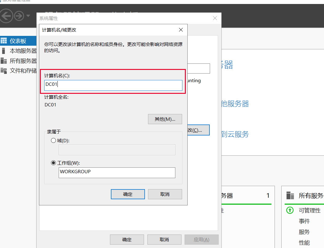 ctrl+r输入sysdm.cpl,回车 - 更改计算机名为DC01(表示第一台域控服务器) - 重启