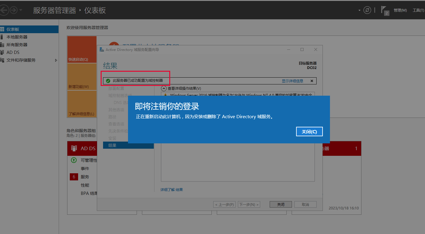 左下角 开始 - 服务器管理器 - 添加角色和功能 - 基于角色或基于功能的安装 - 从服务器池中选择服务器 - 勾选 Active Directory 域服务 - 添加功能 -下一步 - 下一步 - 勾选 ==如果需要,自动重新启动目标服务器== - 安装