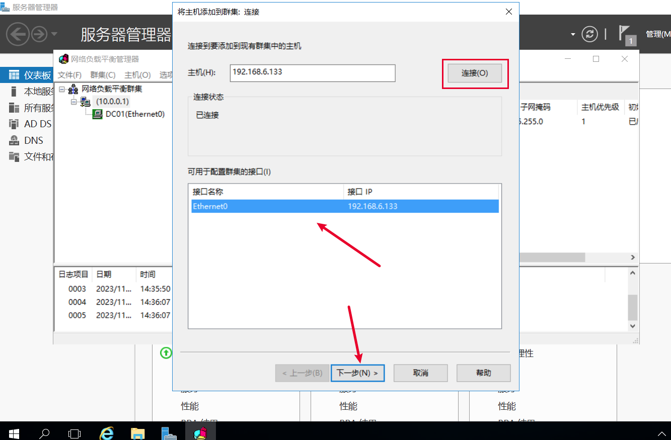 - 在主机栏中输入 DC01 的 IP 地址,然后点击【连接】,连接成功后,下方窗口会显示 DC01 的 IP 地址及网卡名称,点击【下一步】