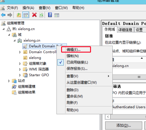 - 工具 → 组策略管理 → 域 → Default Domain Policy → 右键编辑