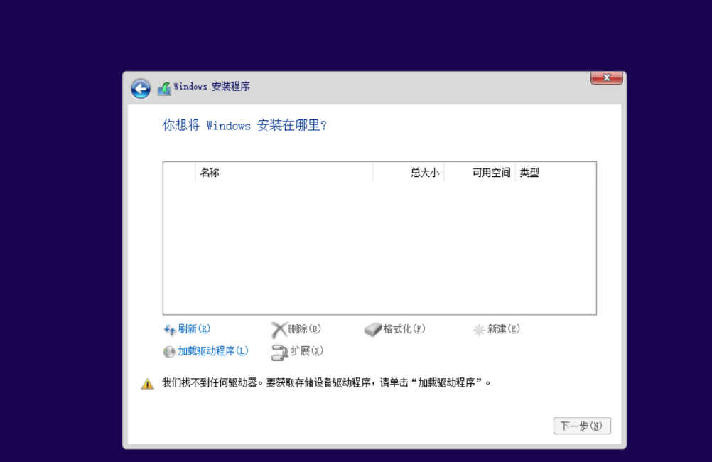 错误:我们找不到任何驱动器。要获取存储设备驱动程序,请单击“加载驱动程序”