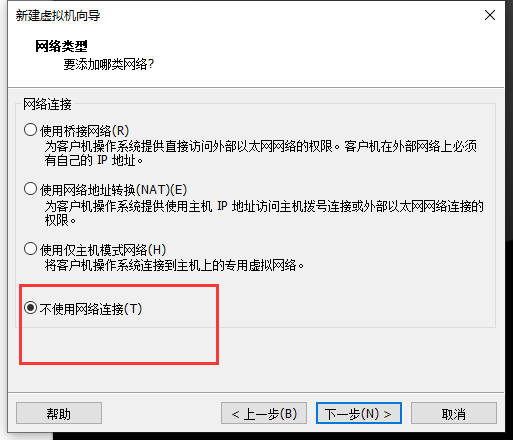 - 网络类型我们选择”不使用网络连接”,接着”下一步”
