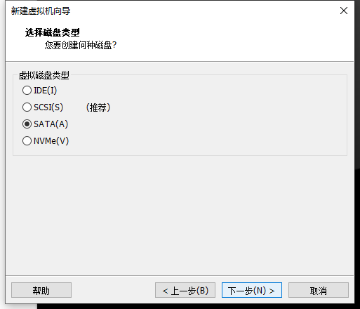 - 虚拟磁盘类型我们选择”SATA”,接着”下一步”