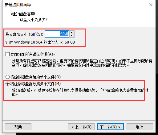- 磁盘大小根据自己大概需要封装多少常用软件进去去设置,十分不建议设置过大然后封装过多的软件进系统,不仅导致封装出的ISO镜像过大,还会让系统的安装变得很慢,出现错误的几率也会增大,然后保持下面默认的的”将虚拟磁盘存储为多个文件”,继续”下一步”