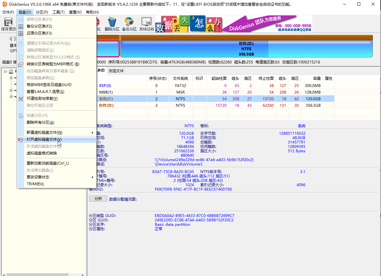 - 打开DiskGenius – 硬盘 – 点击打开虚拟硬盘文件
