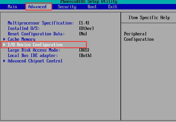 - 切换至”Advanced”菜单,定位到”I/O Device Configuration”,然后按下回车键, 如下图所示