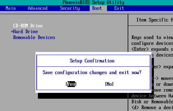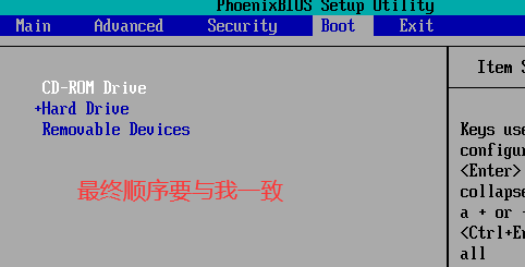 - 切换至”Boot”选项卡,将光驱”CD-ROM Drive”调至最上面(第一启动项),方法: 用键盘上的上下键选中”CD-ROM Drive”,然后通过小键盘上的”+”、”-“号进行位置调整