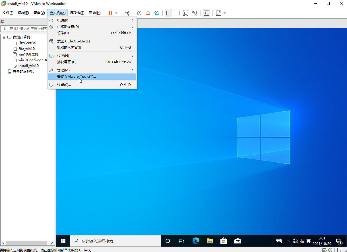 - 在VMware左上方找到”虚拟机”-“安装VMware tools”,为当前的虚拟机安装, 如下图所示