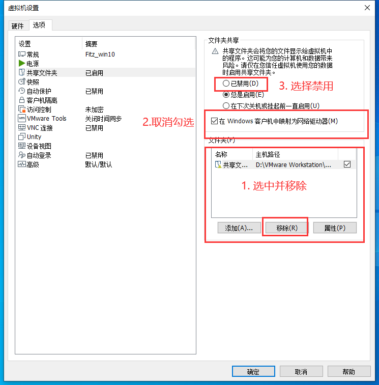 去虚拟机设置 – 选项 – 将共享文件夹移除 – 取消勾选”在客户机中映射为网络驱动器” – 禁用”文件夹共享” 注意:之后再也访问到物理机的资源了,请仔细检查是否准备好,要是误操作了,请重新添加共享文件夹