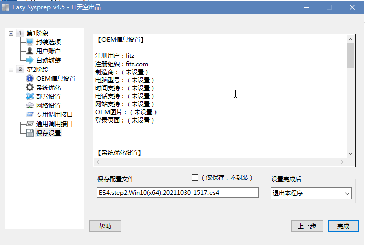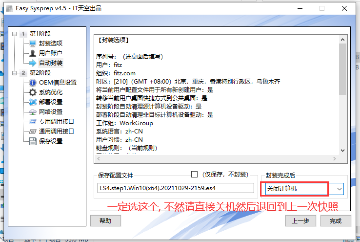 一定要选择完成后关闭计算机 – 点击”完成”后等待即可如果提示封装失败,请退回到上一次快照,再重新进行之后的所有操作