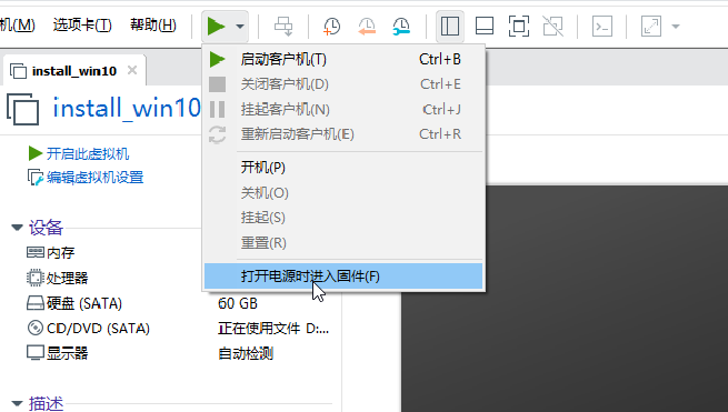 - 接下来返回到虚拟机主界面,点击图中大绿色三角后面的小三角符号,在下拉框中选择”打开电源时进入固件”, 这一步是为了进入虚拟机的BIOS,如图