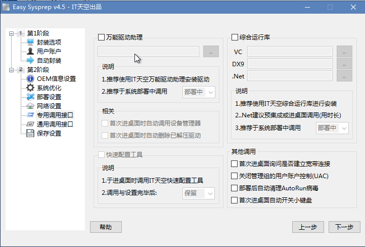 注意:软件不管是预装(封装时嵌入系统中)还是部署时安装,都只能安装到C盘中,如果常用软件安装到其他盘在安装好封装的系统后会发现软件都丢失了,原因是:封装系统只能(是)对C盘进行封装。这些优化都是永久的,这意味着之后每次安装封装好的系统时不再需要进行这些操作